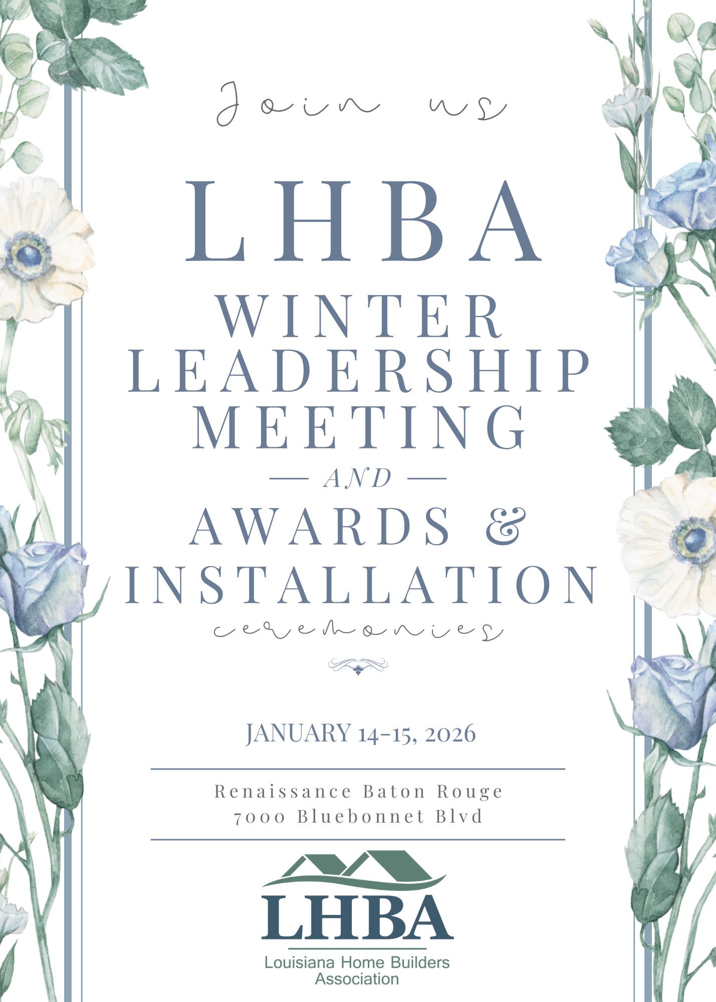 Join fellow members for the 2026 Winter Leadership Meeting in Baton Rouge. Event details include LHBA Committee/Council meetings, a meeting of the LHBA Board of Directors and the Annual Awards & Installation Banquet, celebrating new leadership and honoring award recipients.