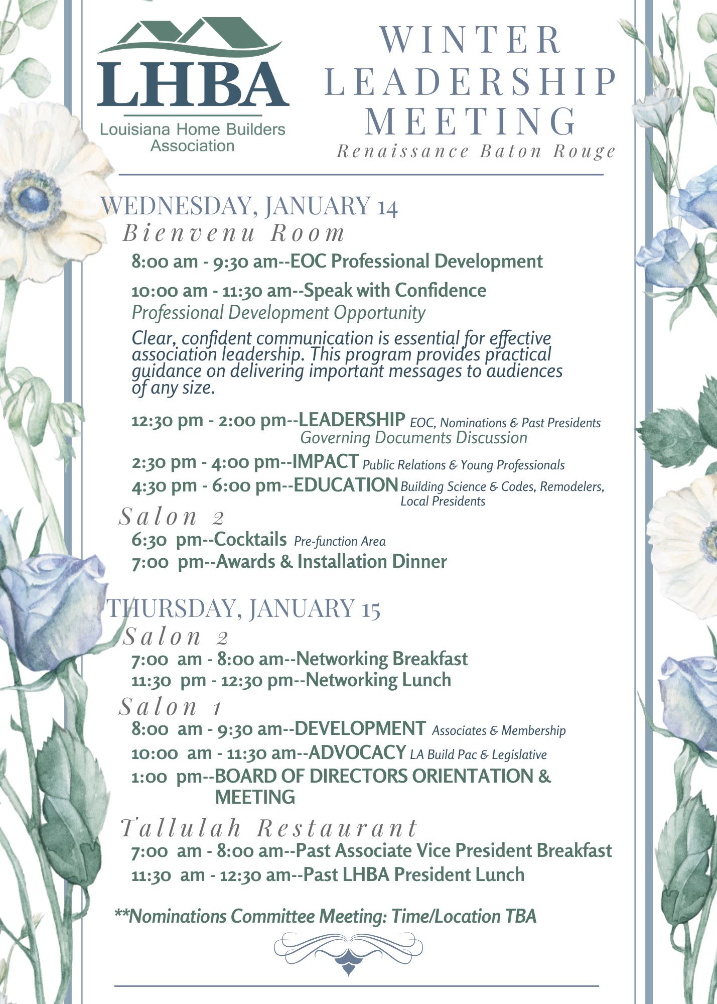 Join fellow members for the 2026 Winter Leadership Meeting in Baton Rouge. Event details include LHBA Committee/Council meetings, a meeting of the LHBA Board of Directors and the Annual Awards & Installation Banquet, celebrating new leadership and honoring award recipients.